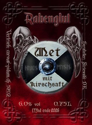 Die Rabenschwingen Odins verdunkeln den Himmel – und darunter lodert eine glutrote Versuchung. Rabenglut ist Met mit dunklem Kirschsaft: mild im Alkohol, aber tief im Aroma. Ein Trank für jene, die Dämmerung und Morgengrauen gleichermaßen lieben.